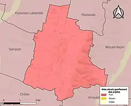Le retrait-gonflement des sols argileux est susceptible d'engendrer des dommages importants aux bâtiments en cas d’alternance de périodes de sécheresse et de pluie. La totalité de la commune est en aléa moyen ou fort (94,5 % au niveau départemental et 48,5 % au niveau national). Sur les 126 bâtiments dénombrés sur la commune en 2019, 126 sont en aléa moyen ou fort, soit 100 %, à comparer aux 93 % au niveau départemental et 54 % au niveau national. Une cartographie de l'exposition du territoire national au retrait gonflement des sols argileux est disponible sur le site du BRGM[24],[Carte 3].