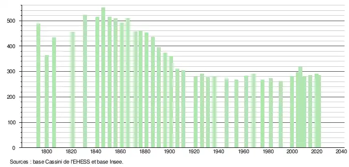L'évolution du nombre d'habitants est connue à travers les recensements de la population effectués dans la commune depuis 1793. Pour les communes de moins de 10 000 habitants, une enquête de recensement portant sur toute la population est réalisée tous les cinq ans, les populations légales des années intermédiaires étant quant à elles estimées par interpolation ou extrapolation[29]. Pour la commune, le premier recensement exhaustif entrant dans le cadre du nouveau dispositif a été réalisé en 2004[30].