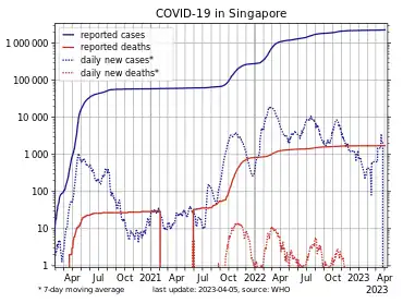 Le graphique montre le nombre total de cas confirmés en fonction du temps (par date) depuis le , date du premier cas signalé à Singapour. L'axe vertical suit une échelle logarithmique. Dans un tel graphique (connu sous le nom de graphique semi-logarithmique ), une croissance exponentielle du nombre de cas apparaîtra sous la forme d'une ligne droite sur le graphique. La pente de la droite détermine le taux de croissance du nombre de cas, avec une pente plus raide représentant un taux de croissance plus élevé.