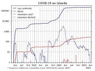 Le , le nombre total de cas enregistrés est de 1 785, dont 1 462 se sont rétablis et 10 sont décédés. Avec une population totale de 364 260 habitants (au ), le taux d'infection est d'un cas pour 245 habitants, l'un des plus élevés au monde. Toutefois, le pays est également celui où le nombre de tests effectués par habitant est le plus élevé au monde[3]. Il s'agit notamment d'un dépistage de la population générale dirigé par la société islandaise deCODE genetics pour déterminer la véritable propagation du virus dans la population[4]. Au , le taux de létalité lié au Covid-19 en Islande était le deuxième plus bas au monde, à 0,29 %[5].