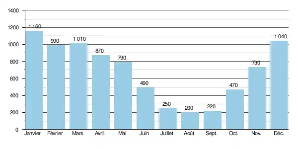 La rivière présente des fluctuations saisonnières de débit très marquées. Les hautes eaux se déroulent en hiver et au printemps et se caractérisent par des débits mensuels moyens allant de 0,79 à 1,16 m3/s, de décembre à mai inclus (avec un maximum en janvier). En juin le débit diminue fortement (0,49 m3/s), ce qui mène rapidement aux basses eaux d'été qui ont lieu de juillet à septembre inclus, entraînant une baisse du débit mensuel moyen allant jusqu'à 0,200 m3/s au mois d'août (200 litres par seconde), ce qui reste très consistant. Mais ces moyennes mensuelles cachent des fluctuations plus prononcées selon les années ou sur de courtes périodes.