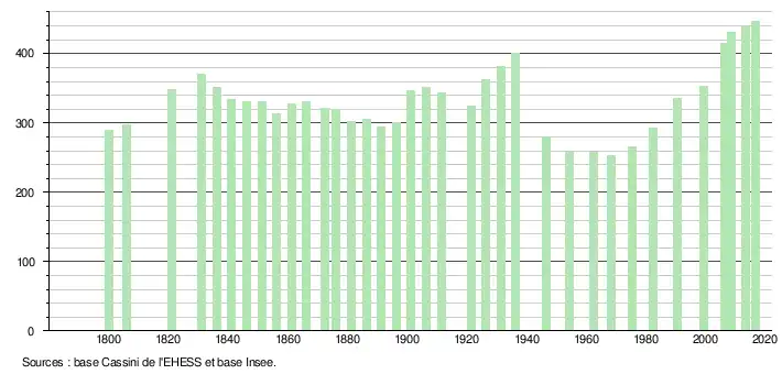 L'évolution du nombre d'habitants est connue à travers les recensements de la population effectués dans la commune depuis 1800. Pour les communes de moins de 10 000 habitants, une enquête de recensement portant sur toute la population est réalisée tous les cinq ans, les populations légales des années intermédiaires étant quant à elles estimées par interpolation ou extrapolation[2]. Pour la commune, le premier recensement exhaustif entrant dans le cadre du nouveau dispositif a été réalisé en 2008[3].