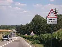 Panneau en place dans le Nord accompagné d'un panneau M9z: « Accotement non stabilisé ».