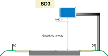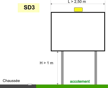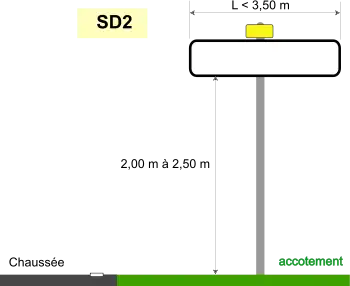 | SD2 | ![]() Longueur au plus égale à 3,50 m sur accotement Hauteur au-dessus du sol : entre 2 m et 2,5 m placés sur un support de type «mât» centré ou décentré |