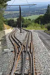 Le tracé s'étend sur les communes d’Orcines et de Ceyssat. L'ensemble des acquisitions foncières représente 18 hectares sur les 28 hectares que nécessite le projet. L'accès au sommet se fait par utilisation de la plate-forme routière elle-même emprise de l'ancienne voie ferrée de 1906, transformée en route à péage en 1926[11]. Le tracé est long de 5,1 km. La gare de départ se situe à une altitude de 890 mètres, la gare d'arrivée à 1 406 mètres. La voie est électrifiée en 1 500 V et sa crémaillère est de type Strub. À voie unique, il y a un point de croisement à mi-parcours à hauteur du chemin des Muletiers. La station de départ se situe à la gare de la Maison-de-Site[12].