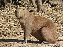 On y compte aussi 80 espèces de mammifères, dont le jaguar (il atteint 2 m de longueur, 0,85 m de hauteur et un poids allant jusqu'à 120 kg), le cerf du Pantanal, la loutre géante, le tamanoir[1], le capybara ou capivara, le singe hurleur (singe qui émet un son assourdissant s'il se sent menacé), le sapajou, le tapir[18], le lobinho (renard crabier, Cerdocyon thous), le cerf des pampas ou veado-campeiro, le veado catingueiro, le guará ou loup à crinière, le capucin à poitrine jaune, le porc de la forêt, le chien des buissons ou cachorro-do-mato, le paresseux, le puma, le coati, le tatou, etc.