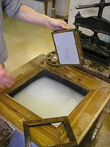 - La fabrication manuelle et artisanale, feuille par feuille et à l'aide de petits tamis, tend à disparaître. Elle est encore pratiquée dans certaines régions de Chine, notamment à Lijiang et par certains aquarellistes soucieux de maîtriser tous les éléments de leur œuvre, des matériaux à la composition.