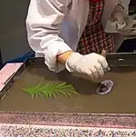 Sa technique de réalisation consiste à faire flotter des pigments sur un liquide légèrement gélifié, puis à produire un motif sur l'eau, et transférer ensuite ce motif sur une feuille de papier.