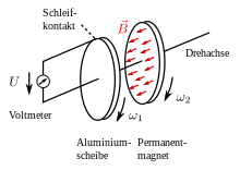 Si maintenant nous considérons l'expérience non pas du point de vue de l'observateur au repos, mais comme un observateur se déplaçant avec le disque (en rotation autour de l'axe), nous mesurerons toujours une tension nulle entre deux points fixes du disque, comme s'il ne se passait rien ; car le champ magnétique est indépendant de toute rotation de l'aimant. Par contre, une tension d'induction sera mesurée dans le circuit entre les contacts glissants rotatifs (pour cet observateur) ; car ce circuit est un conducteur se déplaçant (tournant) dans un champ magnétique.