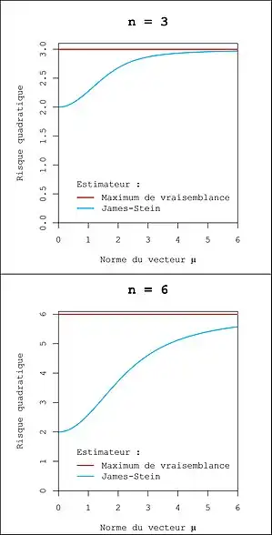 Quelle que soit la valeur de , l'estimateur de James Stein contractant vers domine strictement le maximum de vraisemblance. Bradley Efron et Carl Morris ont montré en 1973[4], qu'utiliser lorsque est un meilleur choix que .