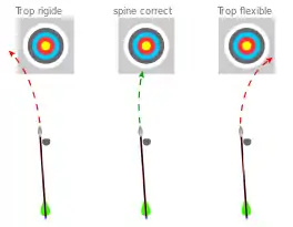 L'amplitude d'oscillation dépend de la rigidité de la flèche, de la puissance de l'arc et de la répartition de masse de la flèche. La rigidité ou "spine" doit être en rapport avec la puissance de l'arc auquel elle est destinée : un arc plus puissant aura besoin d'une flèche plus raide et, au contraire, un arc moins puissant nécessitera une flèche plus flexible. Une amplitude minimale est désirée, justement pour éviter une collision de la flèche avec la poignée, qui dévierait la flèche vers l'intérieur (voir schéma "trop rigide"). Une amplitude trop importante déstabilise le vol vers l'extérieur (voir schéma "trop flexible"), et à l'extrême peut provoquer la rupture de la flèche si celle-ci est en bois, ou bien la tordre si elle est en aluminium.