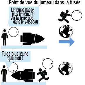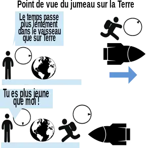 Des jumeaux sont nés sur Terre. L'un fait un voyage aller-retour dans l'espace en fusée à une vitesse proche de celle de la lumière. D'après le phénomène de dilatation des durées de la relativité restreinte, pour celui qui est resté sur Terre la durée du voyage est plus grande que pour celui qui est parti dans l'espace. Pour chaque jumeau, le temps s'écoule normalement à sa propre horloge, et aucune expérience locale ne permet au jumeau voyageur de déterminer qu'il est en mouvement pendant l'aller ou le retour. Mais quand ce dernier rejoint le jumeau terrestre, il s'aperçoit qu'il a mesuré au total moins de secondes et il rentre donc plus jeune que son jumeau sur Terre.