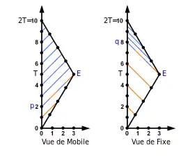 Réciproquement, le jumeau mobile fait le même constat : il constate que les signaux envoyés par le jumeau fixe lui arrivent d'abord à un rythme régulier lent, puis après qu'il a fait demi-tour, à un rythme régulier plus rapide. Le signal envoyé par le jumeau fixe, reçu au moment du demi-tour, a été envoyé au temps p de l'horloge fixe, avec , et est d'autant plus proche du temps de départ que la vitesse du voyage est proche de celle de la lumière[DR 1] ("Vue de Mobile" dans le diagramme ci-contre).