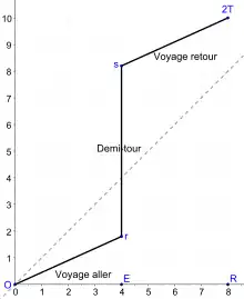 Sur le diagramme ci-contre à droite, les lignes de simultanéité du jumeau mobile sont en bleu lors du voyage aller, et en rouge lors du voyage retour. Quand le jumeau mobile arrive au point de demi-tour E, l'âge simultané du jumeau fixe est , moins avancé que le jumeau mobile, et compatible du fait que - d'un point de vue relativiste - c'est le jumeau fixe qui est en mouvement par rapport au jumeau mobile et vieillit donc plus lentement. Mais, après le demi-tour du jumeau mobile, l'âge « simultané » du jumeau fixe a augmenté soudainement jusqu'à la valeur , bien supérieur à l'âge actuel du jumeau mobile : dans son nouveau référentiel, les plans de simultanéité (lignes en rouge) ont des orientations nettement différentes de celles du précédent (lignes en bleu). Cela illustre la relativité de la simultanéité, qui n'est pas une notion absolue en relativité, mais qui dépend du mouvement relatif des objets considérés. Ensuite, l'âge du fixe vu du mobile augmente de nouveau plus lentement que l'âge du mobile, de la même manière et symétriquement au voyage aller, mais ne pourra jamais compenser le grand différentiel qui rend compte de la différence d'âge des deux jumeaux au retour[Bo 1],[DR 1].