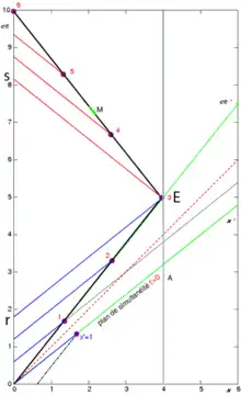 - La droite orthogonale dans un espace de Minkowski n'est pas forcément à angle droit par rapport à la ligne d'univers, comme dans un espace euclidien. Elle est à angle droit pour les lignes d'univers fixes (verticales), mais forme un angle de plus en plus réduit avec la ligne d'univers, à mesure que la ligne d'univers se rapproche de la vitesse de la lumière.