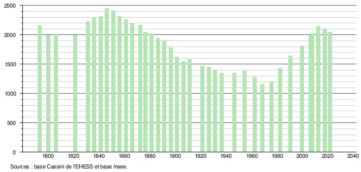 L'évolution du nombre d'habitants est connue à travers les recensements de la population effectués dans la commune depuis 1793. Pour les communes de moins de 10 000 habitants, une enquête de recensement portant sur toute la population est réalisée tous les cinq ans, les populations légales des années intermédiaires étant quant à elles estimées par interpolation ou extrapolation[25]. Pour la commune, le premier recensement exhaustif entrant dans le cadre du nouveau dispositif a été réalisé en 2007[26].