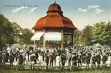 En 1863, la première course a lieu à l'hippodrome de Scheibenholz, à Leipzig-Südvorstadt sur la rive droite de la dérivation inférieure de l'Elster (Elsterflutbett). L'hippodrome avait été construit dans la forêt alluviale sur un terrain appartenant au conseiller municipal Scheibe, d'où le nom « bois de Scheibe »[4]. Au nord de l'hippodrome subsistait un bois. Le paysagiste municipal Otto Wittenberg décide d'en faire un jardin public. Tout comme Seyfferth, l'intention de Wittenberg était de sauvegarder cet espace naturel des promoteurs immobiliers[5], car la surface urbanisée de la ville augmentait d'année en année. Entre 1849 et 1875, la population lipsienne avait plus que doublé, passant de 62 374 à 127 387 hab., une évolution démographique qui allait quintupler jusqu'en 1900, avec l'intégration des communes limitrophes. En convertissant la forêt en jardin public, Wittenberg voulait aussi garantir un couloir naturel entre le centre-ville et la dérivation de l'Elster. En 1877, le jardin public à Scheibenholz (Volksgarten im Scheibenholz) est ouvert. Il sera plus tard renommé en « parc ».