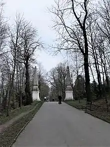 Les obélisques sont populairement connus sous le nom de balançoire de Marie-Thérèse : selon la légende, Marie-Thérèse avait installé une balançoire ici.