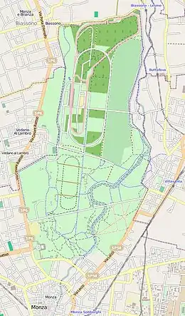 Le parc de Monza est l'un des plus grands parcs urbains historiques d'Europe. L'une de ses principales caractéristiques est qu'il a conservé les murs d'origine de la ville d'environ 14 km. Cette particularité en fait le troisième plus grand parc clos d'Europe après le parc de Chambord avec 32 km[1] et le parc naturel de La Mandria avec ses 30 km[2] Il a une superficie de 732 hectares[3],[4],[5] et est situé au nord de la ville, entre les communes de Monza, Villasanta, Vedano al Lambro et Biassono. Avec les jardins royaux, le parc de Monza constitue un complexe d'une valeur paysagère, historique et architecturale particulière, inclus dans le plus grand parc régional de la vallée du Lambro. Depuis 1922 il abrite l'hippodrome de Mirabello, plus présent aujourd'hui, et un important circuit automobile.