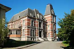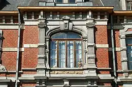 La façade principale comporte un puissant soubassement en pierre bleue et deux niveaux construits en brique rouge. Cette façade, striée de bandeaux[2] de pierre blanche, comporte trois travées. La travée centrale en saillie (formant donc un « avant-corps ») est précédée d'un escalier qui donne accès à une porte monumentale dont l'encadrement mouluré, flanqué de pilastres massifs, porte un arc surbaissé dont la clé d'arc en fort relief est surmontée d'un petit fronton triangulaire. Portée par un entablement soutenu par des consoles à triglyphes, la baie de l'étage qui surmonte la porte est flanquée de pilastres cannelés surmontés de chapiteaux ioniques : sa clé d'arc est surmontée d'un petit fronton courbe, qui répond au fronton triangulaire du niveau inférieur. Les fenêtres des travées latérales sont ornées de bossages en pointe-de-diamant[2].