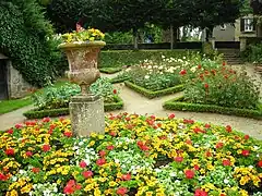 La roseraie comporte une partie qui se rapproche du style à l'anglaise avec ses allées sinueuses, végétaux à port très variés et une partie plus classique avec des massifs de nombreuses variétés de rosiers entourées de bordures de buis.