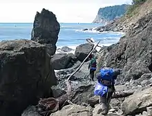 Le climat de la forêt côtière se caractérise par des températures douces et des précipitations importantes. Les plantes présentes à proximité de l'océan doivent en outre être résistantes au sel amené par les vents marins. Les espèces principales de cette forêt sont l'Épicéa de Sitka (Picea sitchensis) qui peut atteindre 80 m et 500 ans[35], la Pruche de l'Ouest (Tsuga heterophylla), le Thuya géant de Californie (Thuja plicata), l’Aulne rouge (Alnus rubra) tandis que les arbustes se nomment Gaulthérie (Gaultheria shallon), Airelle (Vaccinium ovatum) et Ronce remarquable (Rubus spectabilis). Le sol accueille le Chèvrefeuille involucré (Lonicera involucrata), le Blechnum en épi (Blechnum spicant), le Polystic à épées (Polystichum munitum) et la malodorante Lysichite jaune (Lysichiton americanum)[36].