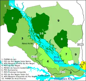 Le parc se trouve dans les municipalités de Manaus et Novo Airão[1]. Il est géré par l'Institut Chico Mendes pour la conservation de la biodiversité[2]. La partie fluviale du parc, représentant 60% de la surface totale, compte plus de 400 îles. Le parc mesure environ 130 km de long pour une moyenne de 20 km de large, soit une superficie totale de 350 470 hectares (3 504,7 kilomètres carrés)[1]. Le parc est délimité au nord et à l'est par la Zone protégée de la rive gauche du Rio Negro, une zone de conservation durable de 611 008 hectares (6 110,08 kilomètres carrés) créée en 1995. La partie fluviale s'étend jusqu'à la rive ouest du Rio Negro, qui est principalement protégé par la zone protégée de la rive droite du Rio Negro et la réserve durable du Rio Negro[3].
