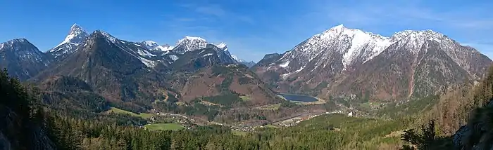 Panorama sur le parc national de Gesäuse depuis Rotmauer. Dans les montagnes on voit le Lugauer ou le Planspitze. Dans la vallée, la commune de Hieflau. Avril 2021.
