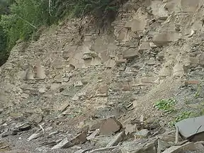 Le grès correspond au moment où le courant était le plus puissant[12]. La base de ses couches présente souvent des moulages de flûtes et des traces d'objets trainés correspondant à un courant turbulent[12]. Quant aux couches de laminites, elle correspondent à des couches d'argiles qui se sont déposés dans un milieu beaucoup plus calme. Ces dernières sont généralement très fossilifères[12].