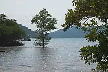 On y trouve en bord de mer des palétuviers « noirs » avicennia alba...; puis un peu en arrière des palétuviers « rouges » rhizophora apiculata et rhizophora mucronata... ; ensuite, un peu plus en arrière des palétuviers bruguiera gymnorhiza et bruguiera parviflora...