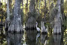 Les cyprès sont des conifères qui se développent facilement dans l’eau douce et qui poussent dans des structures compactes, appelées « dômes », sur de longues rives de calcaire. Grâce à leurs pneumatophores ils peuvent survivre à la forte variation du niveau de l'eau autour de ces dômes. Des cyprès nains peuvent toutefois pousser dans des zones sèches où le sol est plus pauvre en nutriment. Les branches et les troncs des cyprès constituent un lieu privilégié pour l’installation de plantes aériennes appelées épiphytes, telles broméliacées, les mousses espagnoles, les orchidées et les fougères. Le parc abrite à lui seul près de vingt-cinq espèces d'orchidées[34]. Les plus grands d'entre eux constituent d'excellents lieux de nidification pour des oiseaux comme le dindon sauvage, l'ibis, le héron, l'aigrette, l’anhinga et le martin-pêcheur d'Amérique. Dans ces zones, on trouve habituellement des cerfs de Virginie, des écureuils, des ratons laveurs, des opossums, des mouffettes, des lapins des marais, des loutres de rivière, des lynx roux ainsi que de petits rongeurs[35].