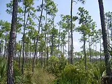 Souvent appelé pinède rocheuse, l'écosystème de la pinède des Everglades est caractérisé par un loam sablonneux, sec et peu profond posé sur un substrat calcaire et couvert presque exclusivement de pins (Pinus elliottii). Les arbres grandissent dans des dolines, où le calcaire fin s'est rempli de terre, permettant aux plantes et aux arbres de pousser[25]. Les pins du sud de la Floride favorisent les incendies par l'existence de lits de séchage des aiguilles de pin et de l'excrétion d'écorce sèche. Ce qui rentre naturellement dans un cycle biologique, puisque leurs pommes ont besoin de la chaleur du feu pour s'ouvrir et disperser leurs graines. Cependant, le corps de ces pins est résistant au feu, et c'est pourquoi des incendies contrôlés sont provoqués tous les trois à sept ans dans ces zones[26]. La plupart des plantes de la zone fleurit environ 16 semaines après un incendie[27].