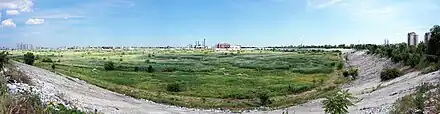 Vue du parc naturel de Văcărești devant des bâtiments résidentiels à Bucarest. | |