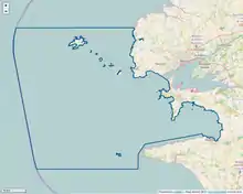 Le Parc naturel marin d'Iroise s’étend sur 3 550 km2 de zones immergées[13] entre le parallèle 48°31'N (au Nord de l’île d’Ouessant) et le parallèle 47°59'N (au Sud de l’île de Sein), le trait de côte à l'Est à l'exception de la rade de Brest et la limite des eaux territoriales (12 milles marins) à l'Ouest. Les espaces côtiers et terrestres ne sont donc pas visés par le parc, mais une partie de ceux-ci font partie du Parc naturel régional d'Armorique.