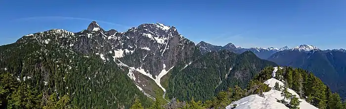 Le panorama sur le parc provincial Golden Ears depuis le sommet de Evans Peak. Mai 2021.