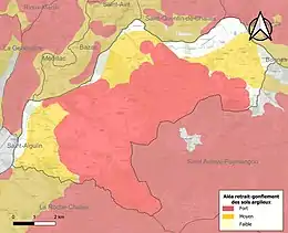 Les mouvements de terrains susceptibles de se produire sur la commune sont des tassements différentiels[38]. Le retrait-gonflement des sols argileux est susceptible d'engendrer des dommages importants aux bâtiments en cas d’alternance de périodes de sécheresse et de pluie[39]. 88 % de la superficie communale est en aléa moyen ou fort (58,6 % au niveau départemental et 48,5 % au niveau national métropolitain)[40]. Depuis le , en application de la loi ÉLAN, différentes contraintes s'imposent aux vendeurs, maîtres d'ouvrages ou constructeurs de biens situés dans une zone classée en aléa moyen ou fort[Note 5],[41].