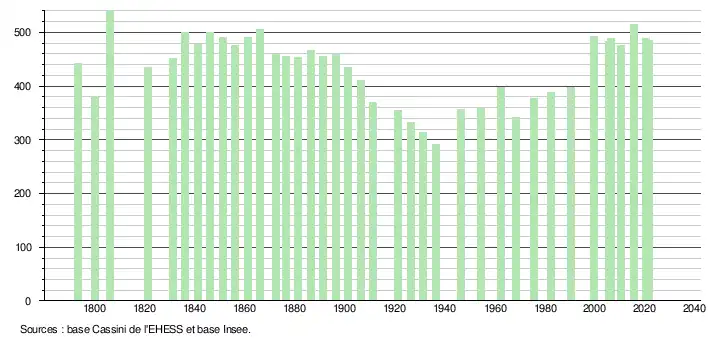 L'évolution du nombre d'habitants est connue à travers les recensements de la population effectués dans la commune depuis 1793. Pour les communes de moins de 10 000 habitants, une enquête de recensement portant sur toute la population est réalisée tous les cinq ans, les populations légales des années intermédiaires étant quant à elles estimées par interpolation ou extrapolation[18]. Pour la commune, le premier recensement exhaustif entrant dans le cadre du nouveau dispositif a été réalisé en 2005[19].