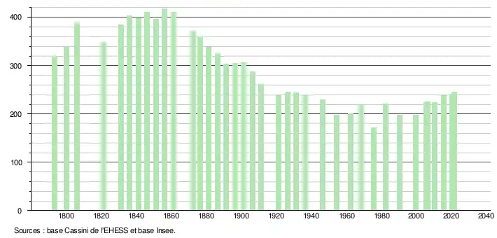L'évolution du nombre d'habitants est connue à travers les recensements de la population effectués dans la commune depuis 1793. Pour les communes de moins de 10 000 habitants, une enquête de recensement portant sur toute la population est réalisée tous les cinq ans, les populations légales des années intermédiaires étant quant à elles estimées par interpolation ou extrapolation[17]. Pour la commune, le premier recensement exhaustif entrant dans le cadre du nouveau dispositif a été réalisé en 2005[18].