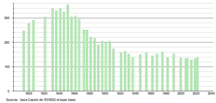 L'évolution du nombre d'habitants est connue à travers les recensements de la population effectués dans la commune depuis 1793. Pour les communes de moins de 10 000 habitants, une enquête de recensement portant sur toute la population est réalisée tous les cinq ans, les populations légales des années intermédiaires étant quant à elles estimées par interpolation ou extrapolation[20]. Pour la commune, le premier recensement exhaustif entrant dans le cadre du nouveau dispositif a été réalisé en 2008[21].