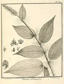 « PARIANA campeſtris. (Tabula 337.)Planta perennis, plures culmos bipedales è radice emittens. Folia alterna, ovata, ampla, ſtriata, acuta, infernè pallidè virentia, brevi petiolata, petiolo enato è vaginâ longitudinali pilis longis, rufeſcentibus, coronatâ. Florum ſpica terminalis. Verticilli florum quaſi per articulos ſecedunt maturo fructu.