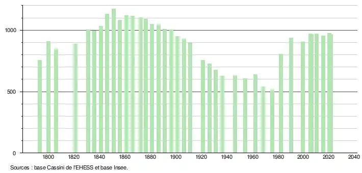 L'évolution du nombre d'habitants est connue à travers les recensements de la population effectués dans la commune depuis 1793. Pour les communes de moins de 10 000 habitants, une enquête de recensement portant sur toute la population est réalisée tous les cinq ans, les populations légales des années intermédiaires étant quant à elles estimées par interpolation ou extrapolation[14]. Pour la commune, le premier recensement exhaustif entrant dans le cadre du nouveau dispositif a été réalisé en 2005[15].