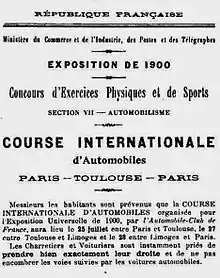 Longue de 1 347 kilomètres, elle se tient finalement du 25 au dans le cadre de l'Exposition universelle de Paris en 1900[1], elle-même organisée lors des Jeux olympiques d'été de 1900[2]. Trois catégories officielles sont reconnues par le règlement de 1899 de l'ACF: voitures, voiturettes, et motocycles.