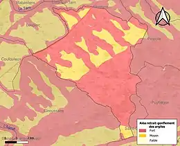 La commune est vulnérable au risque de mouvements de terrains constitué principalement du retrait-gonflement des sols argileux[26]. Cet aléa est susceptible d'engendrer des dommages importants aux bâtiments en cas d’alternance de périodes de sécheresse et de pluie. La totalité de la commune est en aléa moyen ou fort (76,3 % au niveau départemental et 48,5 % au niveau national). Sur les 404 bâtiments dénombrés sur la commune en 2019, 404 sont en aléa moyen ou fort, soit 100 %, à comparer aux 90 % au niveau départemental et 54 % au niveau national. Une cartographie de l'exposition du territoire national au retrait gonflement des sols argileux est disponible sur le site du BRGM[27],[Carte 3].