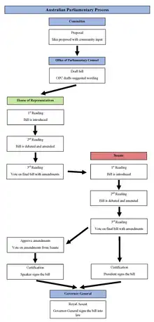 Le principal rôle du Parlement est de voter les lois. Chaque membre du Parlement peut proposer un texte de loi (a bill) à l'exception des lois sur le budget (proposition de dépense ou de taxe nouvelle) qui doivent d'abord être présentées à la Chambre des représentants. En pratique, la majorité des lois est présentée par le gouvernement. Tous les projets de lois doivent être approuvés par les deux chambres pour être adoptés. Le Sénat a les mêmes pouvoirs législatifs que la Chambre des représentants sauf qu'il ne peut pas modifier le projet de budget: il peut simplement l'approuver ou le rejeter. La formule officielle des délibérations du Parlement est: « The Parliament of Australia enacts:: » (« Le Parlement d'Australie promulgue: »).