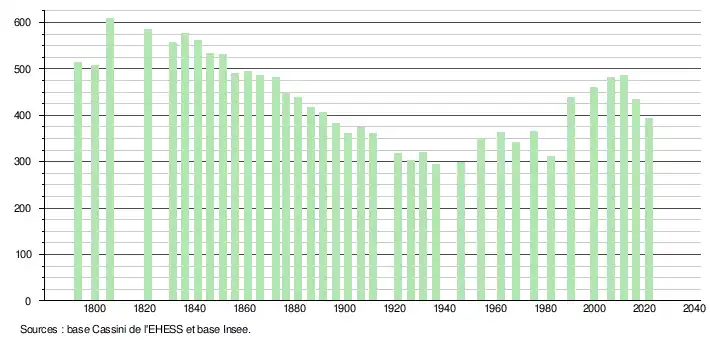 L'évolution du nombre d'habitants est connue à travers les recensements de la population effectués dans la commune depuis 1793. Pour les communes de moins de 10 000 habitants, une enquête de recensement portant sur toute la population est réalisée tous les cinq ans, les populations légales des années intermédiaires étant quant à elles estimées par interpolation ou extrapolation[25]. Pour la commune, le premier recensement exhaustif entrant dans le cadre du nouveau dispositif a été réalisé en 2006[26].