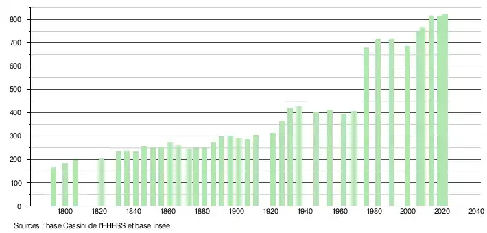 L'évolution du nombre d'habitants est connue à travers les recensements de la population effectués dans la commune depuis 1793. Pour les communes de moins de 10 000 habitants, une enquête de recensement portant sur toute la population est réalisée tous les cinq ans, les populations légales des années intermédiaires étant quant à elles estimées par interpolation ou extrapolation[21]. Pour la commune, le premier recensement exhaustif entrant dans le cadre du nouveau dispositif a été réalisé en 2008[22].