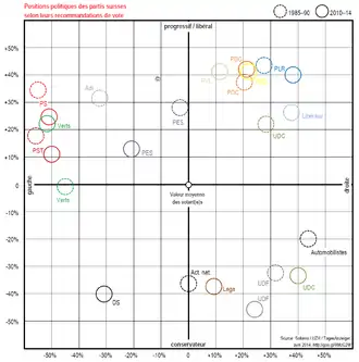 Les quatre partis les plus importants, présents dans la plupart des cantons, sont l’Union démocratique du centre (UDC), le Parti socialiste (PS), le Parti libéral-radical (PLR)[N 1] et le Centre[N 2]. Les Verts[N 3] sont le plus important des partis non gouvernementaux à l'échelon fédéral.