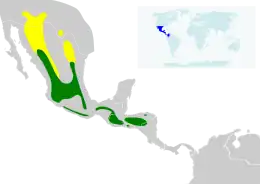 Elle est commune à des altitudes comprises entre 1 500 et 2 500 m et construit son nid dans les chênaies ouvertes et les canyons d'Amérique centrale, mais aussi au nord jusque dans l'Arizona et le Nouveau-Mexique aux États-Unis, dans les Madrean Sky Islands, ainsi que la Mogollon Rim plus au nord (régions du sud du Plateau du Colorado). Au cours de l'hiver, ces oiseaux peuvent migrer jusqu'au Nicaragua.Un couple a été vu à Québec (Canada),au début du mois de juin, au Domaine de Maizerets, ce qui est très rarissime, voir quebecoiseaux.org pour photos.