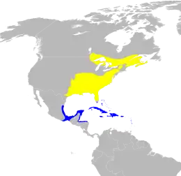 La Paruline à collier est migratrice. Elle hiverne dans le sud de la Floride, le nord de l'Amérique centrale, les Antilles et la plupart des Petites Antilles. Cette espèce est un vagabond très rare en Europe occidentale[1]. La Paruline à collier est encore un nicheur commun dans la majeure partie de l'est de l'Amérique du Nord. Cependant, on ne la retrouve plus dans plusieurs régions qui étaient probablement autrefois des aires de reproduction. Elle a disparu, en tant qu'espèce reproductrice, d'une grande partie du Midwest ainsi que de nombreuses régions du Massachusetts, du New Jersey, du Connecticut, de l'état de New York, du Rhode Island et du Vermont. Des changements dans l'habitat ou l'augmentation de la pollution de l'air ont limité la croissance des épiphytes sur les arbres dont dépendait la paruline pour la nidification sont amenés comme explication. La coupe à blanc et l'assèchement des tourbières ont considérablement réduit la quantité d'habitat convenable dans l'est de l'Amérique du Nord[2].