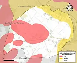 Les mouvements de terrains susceptibles de se produire sur la commune sont des tassements différentiels[17]. Le retrait-gonflement des sols argileux est susceptible d'engendrer des dommages importants aux bâtiments en cas d’alternance de périodes de sécheresse et de pluie[18]. 44 % de la superficie communale est en aléa moyen ou fort (54,9 % au niveau départemental et 48,5 % au niveau national)[Carte 2]. Depuis le , en application de la loi ELAN, différentes contraintes s'imposent aux vendeurs, maîtres d'ouvrages ou constructeurs de biens situés dans une zone classée en aléa moyen ou fort[Note 3],[19].